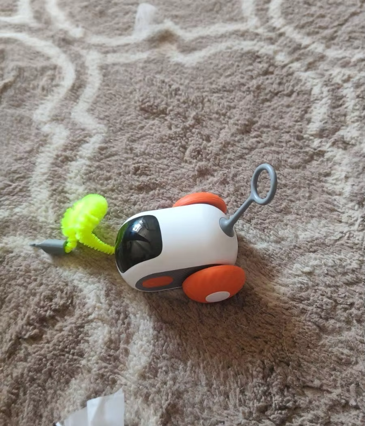 Produit conforme à la description. Mon chat a mis un peu de temps à s'y habituer, mais maintenant il joue avec tous les jours. Le jouet ne se coince pas sous les meubles grâce à sa fonction de changement de direction. Très satisfait de mon achat.