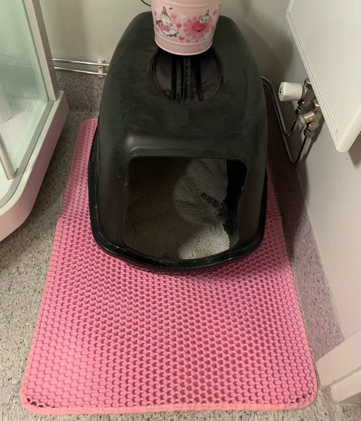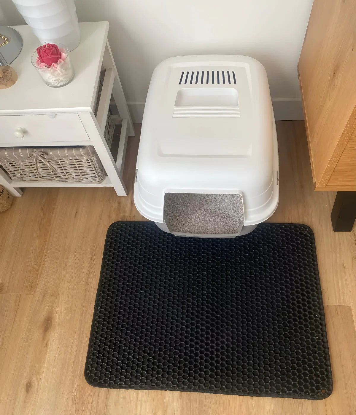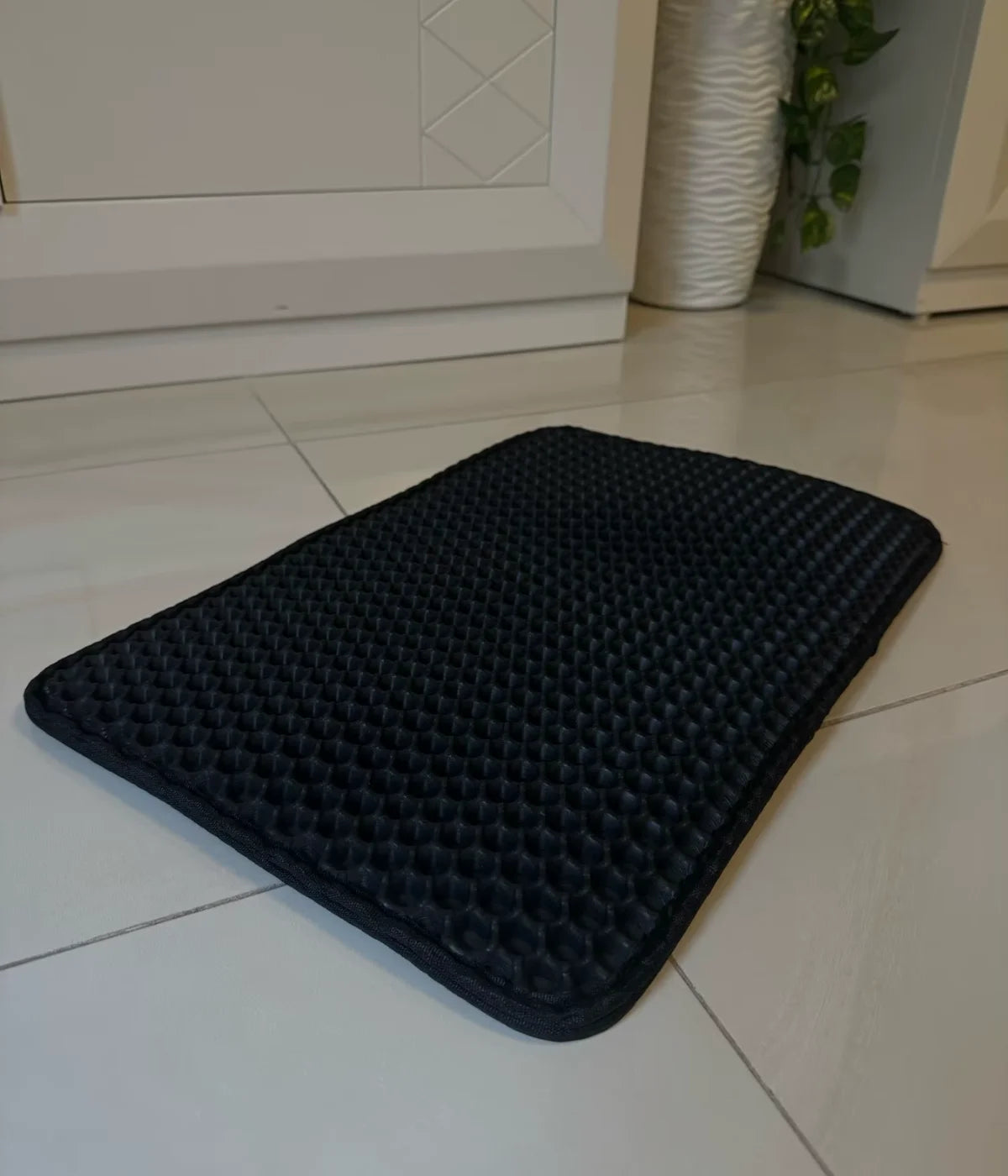 My Maine Coon always had a tendency to spread litter everywhere, but since I got the 60x90 cm mat, he has enough space to get out of his crate comfortably and even lie down on it. The mat stays in place, it holds well, and a quick spray with a shower is enough to clean it.