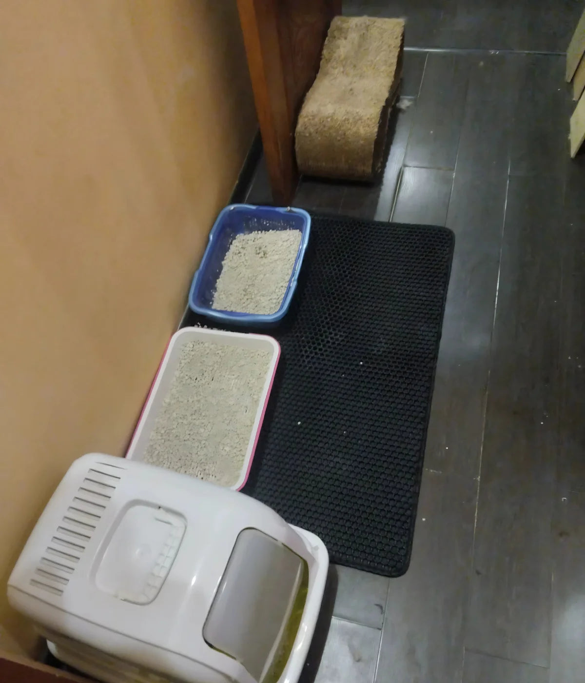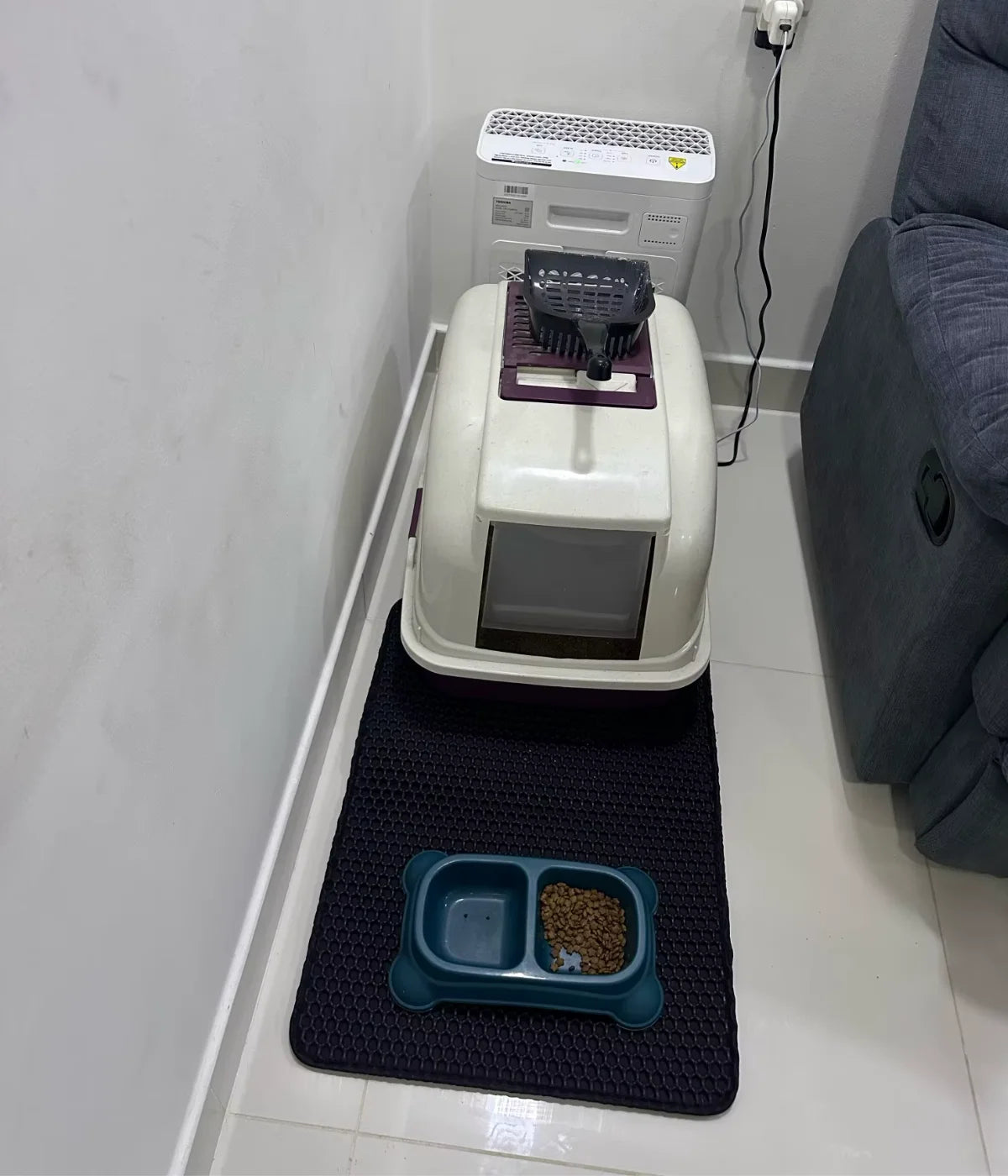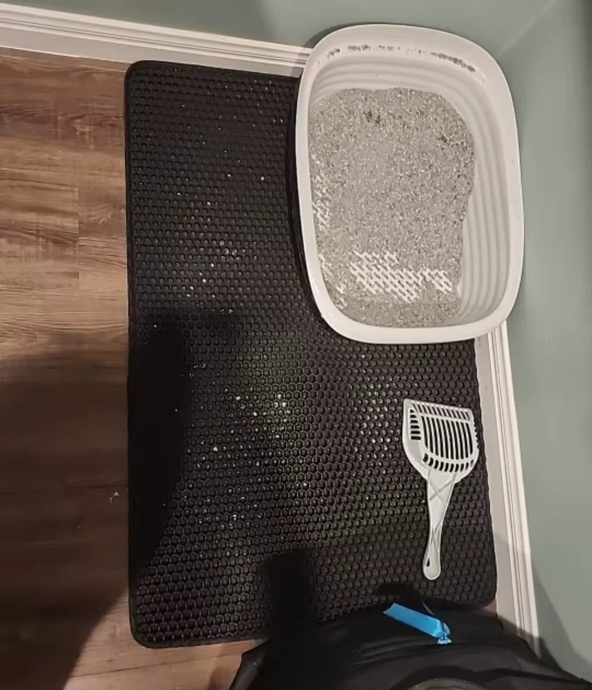 My Maine Coon always had a tendency to spread litter everywhere, but since I got the 60x90 cm mat, he has enough space to get out of his crate comfortably and even lie down on it. The mat stays in place, it holds well, and a quick spray with a shower is enough to clean it.