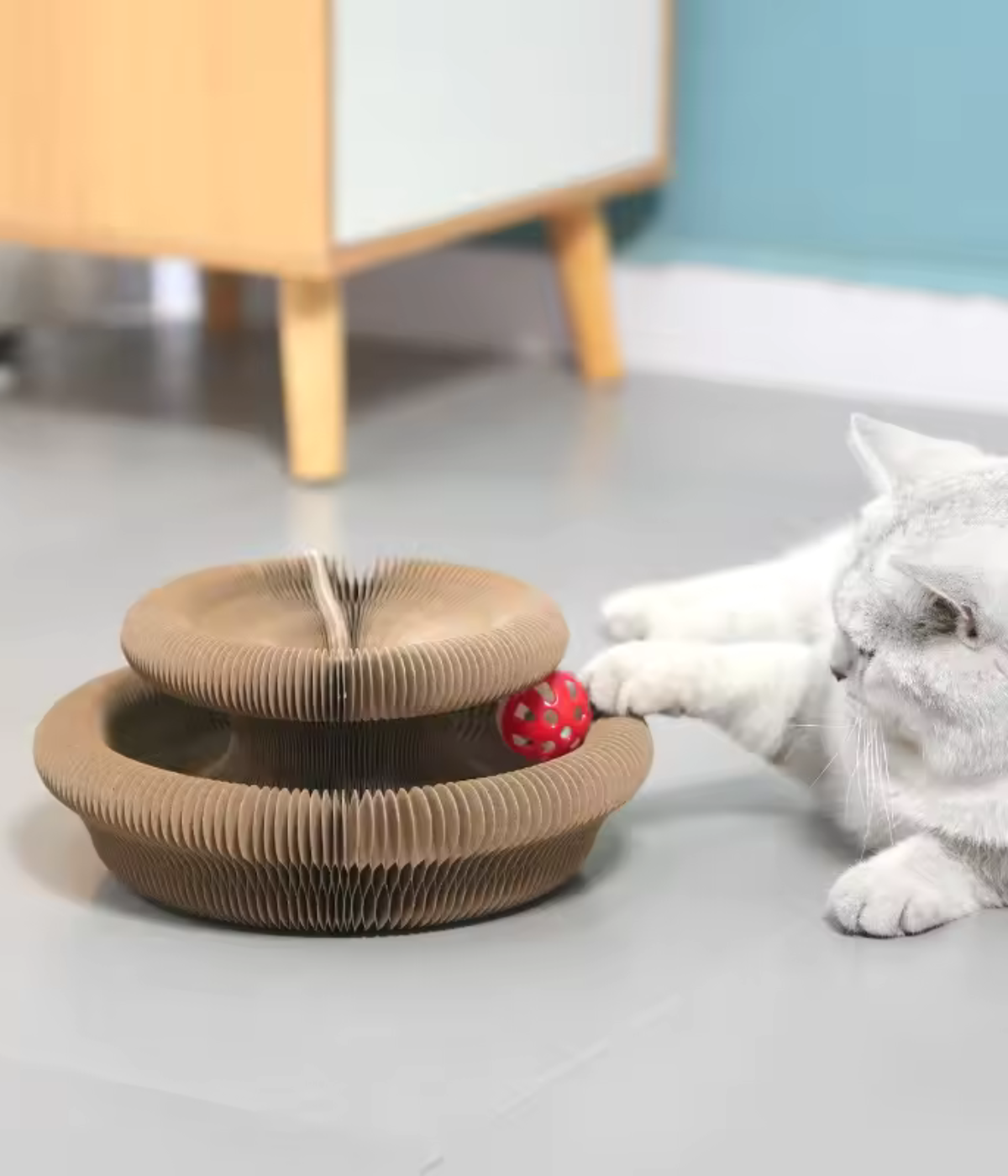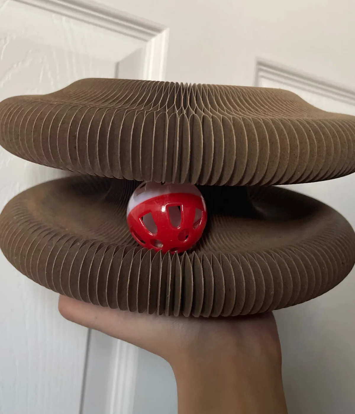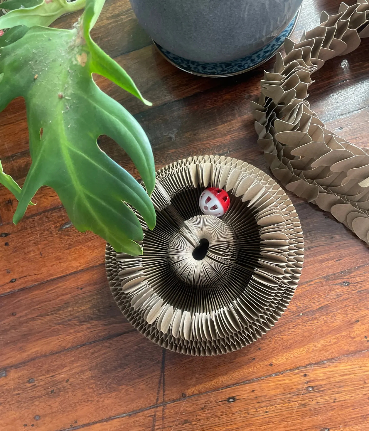 Conçu en carton ondulé robuste et écologique, ce jouet 3-en-1 fait office de griffoir, d’aire de jeu et de repose-patte. Grâce à sa forme innovante en nid d’abeille et à sa balle intégrée, il stimule l’instinct naturel de votre chat, l’encourage à griffer le carton plutôt que vos meubles et l’aide à libérer son énergie de façon saine et amusante.